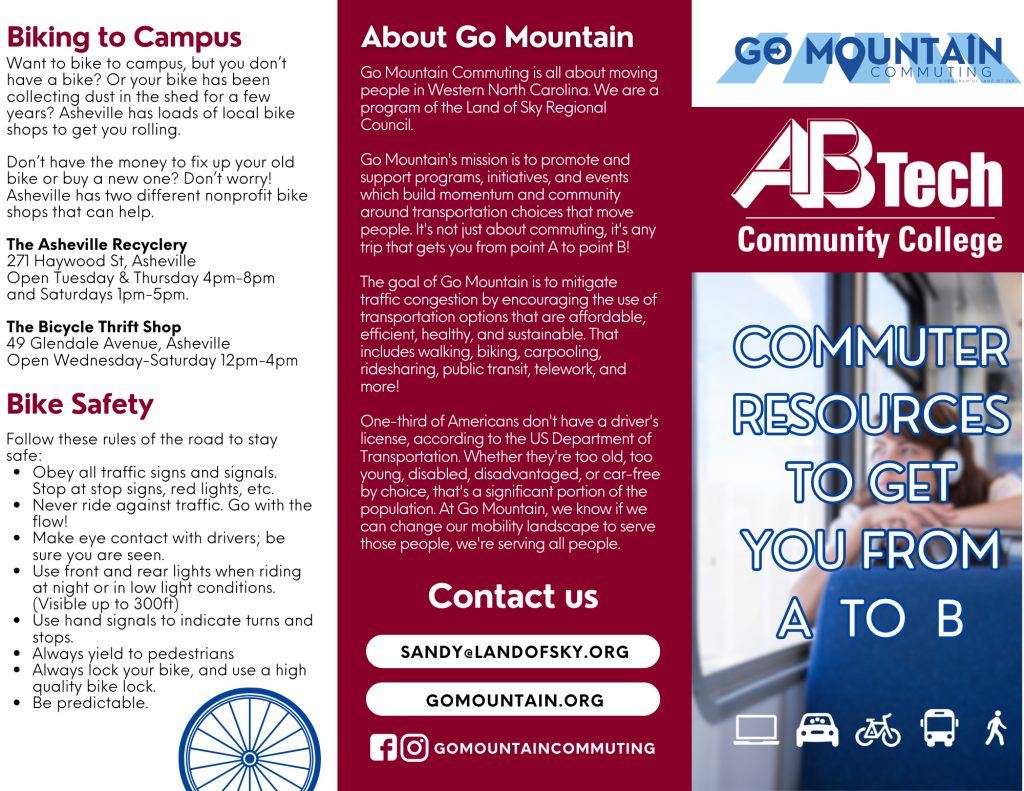 Creation of workplace or campus-specific outreach materials and resources. Once we’ve walked through the steps above, Go Mountain Commuting can create tailored outreach materials for your employees or students. You can then have those materials available in your resource offices, new employee or new student orientations, or send out in emails and newsletters. Examples: A flyer for your public bathrooms, a brochure for your front desk, a digital sign for your on-site screens, or a PDF to include in your email blasts. (Examples below include brochures, flyers, and digital signs.)